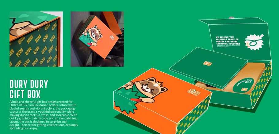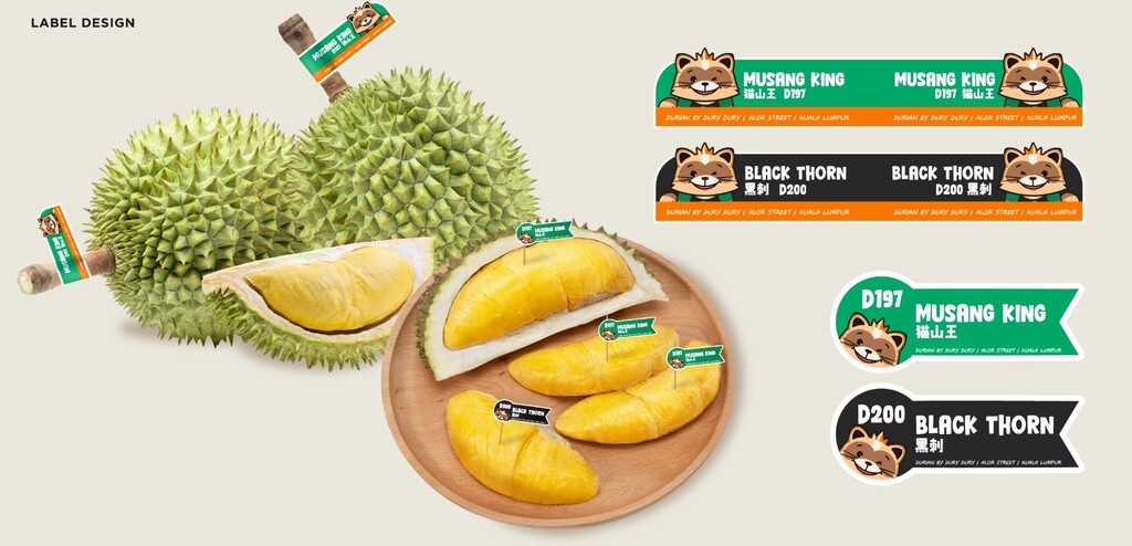 Dury Dury is a vibrant durian retail brand based in Jalan Alor, Kuala Lumpur, offering premium Malaysian durians such as Musang King, Black Thorn, D24 and more through dine-in, delivery, buffets and farm tours. The goal was to refresh the perception of durian from traditional to trendy through a visual identity that feels fun, memorable and appealing to both local and international audiences.