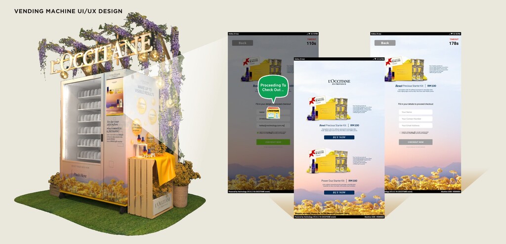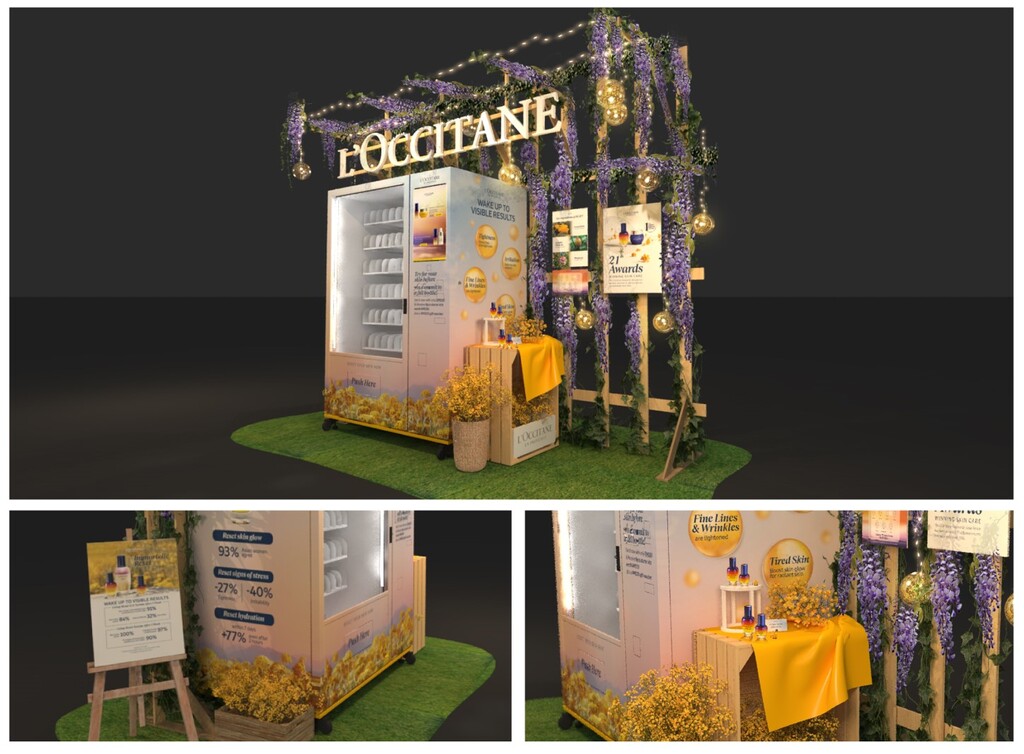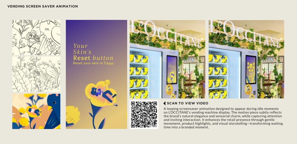 This project was created for L’OCCITANE as a campaign visual and vending experience design solution, blending the brand’s signature elegance with a clean and approachable retail presentation. The scope covered event decoration, vending machine visuals, interface design and screen animation to create a seamless beauty shopping experience in a compact retail setting.